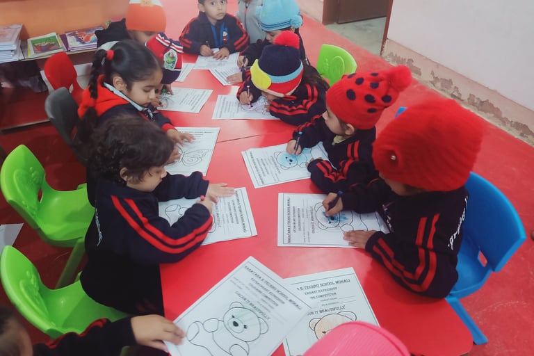 Bright classroom filled with smiling children engaged in colorful art and play activities.